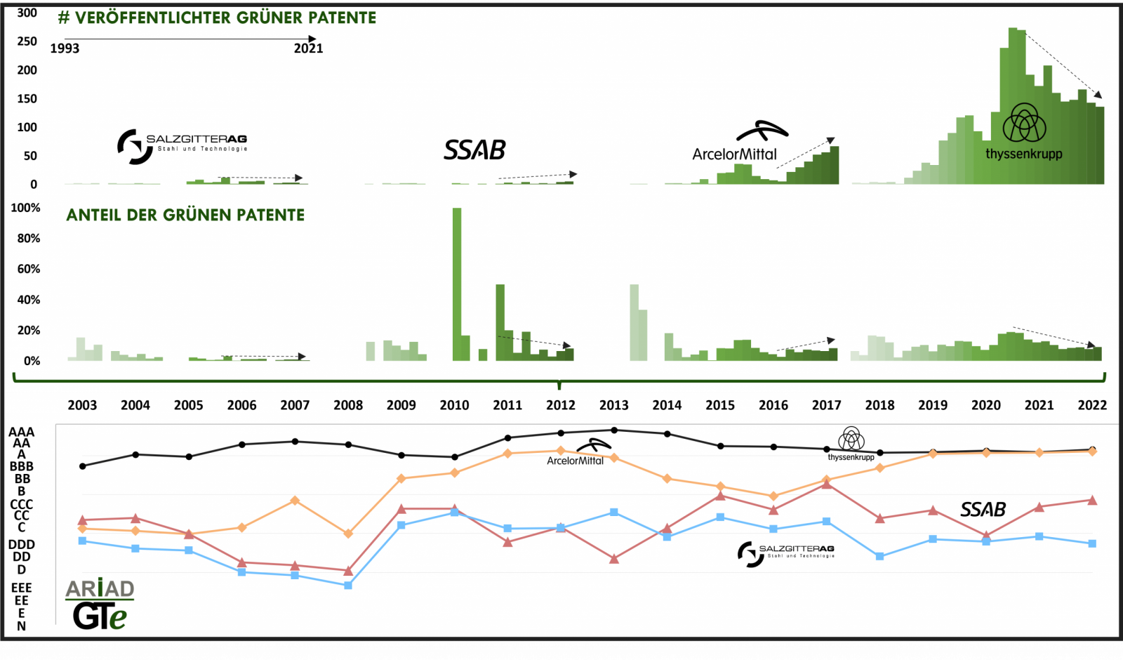 Das dargestellte Beispiel zeigt gut, wie sich ein Rating ergibt: So können besonders gute Ratings (z.B. AA, bzw. ein Score von >8) erreicht werden durch eine hohe Anzahl an grünen Patenten im Vergleich zum Universum (ThyssenKrupp), oder durch eine sehr starke positive Dynamik und ein hoher Grad an Spezialisierung auf nachhaltige Technologien (ArcelorMittal).